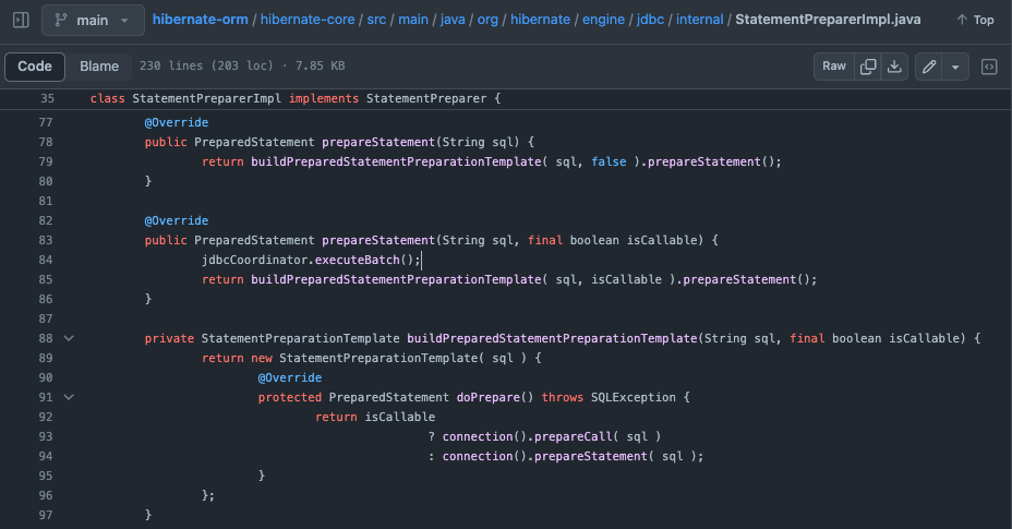 ์คํ๋ง์์๋ JPA ์ ํํ๋ ORM ๊ตฌํ์ฒด์ธ Hibernate๊ฐ Prepared Satement ๊ตฌ๋ฌธ์ผ๋ก SQL์ ์คํ์ํค๊ณ ์๋ค.