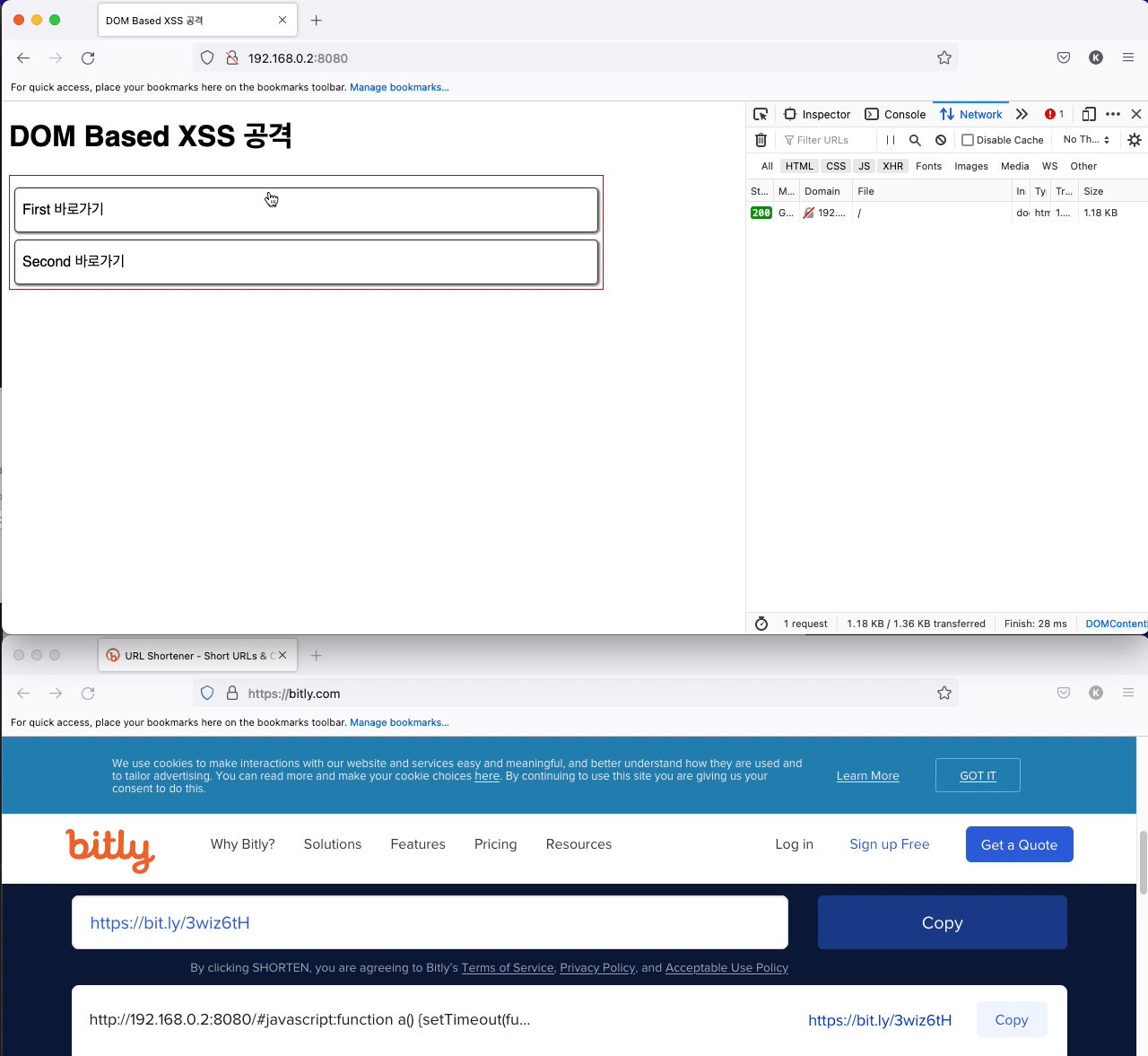 3. DOM XSS : ๊ณต๊ฒฉ ์คํฌ๋ฆฝํธ๊ฐ ํฌํจ๋ URL์ ์ฌ์ฉ์๊ฐ ์ ์ํ๊ฒ ์ ๋ํ๋ค. ํด๋น URL๋ก ์น ์ฌ์ดํธ์ ์ ์ํ ๊ฒฝ์ฐ, ์๋ฒ๊ฐ URL ํ๋ผ๋ฏธํฐ๋ฅผ ๊ฒ์ฆ์์ด ์๋ต HTML์ ๋ด๊ณ ์ฌ์ฉ์์ ๋ธ๋ผ์ฐ์ ๋ ์๋ต๋ฐ์ ๋น์ ์ HTML์ ์คํํ๋ ๊ณผ์ ์์ ๊ณต๊ฒฉ ์คํฌ๋ฆฝํธ๊ฐ ์คํ๋๋ค.