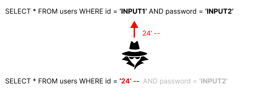 24'-- ๋ผ๋ ๊ตฌ๋ฌธ์ ์ฃผ์ ํจ์ผ๋ก์จ, 24' ๋ถ๋ถ์ด id๊ฐ 24์ธ ์กฐ๊ฑด์ ์ ์์ฑํ๊ณ -- ๋ถ๋ถ์ด ๋ค์ password ๊ฒ์ฆ ์กฐ๊ฑด์ ์ ์ฃผ์์ฒ๋ฆฌํ์ฌ 24๋ฒ ์ ์ ์ ๊ฐ์ธ ์ ๋ณด๊ฐ ๋ ธ์ถ๋๋ ๊ฒ์ด๋ค. ๋ง์ฝ password ์ปฌ๋ผ์ด ์ํธํ๋์ด ์์ง ์๋ค๋ฉด, ๊ณ์ ๊น์ง ํ์ทจ๋ ๊ฒ์ด๋ค.