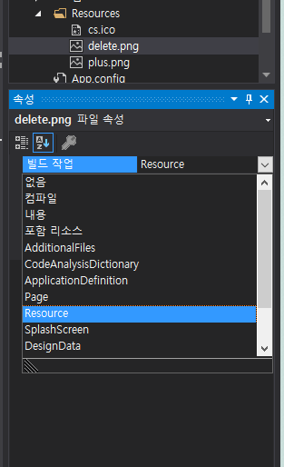 리소스에 추가한 각각의 파일의 속성을 변경해야 함. 파일 속성 안의 "빌드 작업" 값을 "Resource"로 변경.